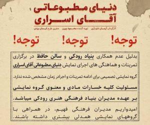 مینا: نمایشگاه گروهی نقاشی و ترکیب مواد با عنوان “رنگ سرودهها” با ارائه آثاری از آبان مهرابی، بهناز رادحسینی، پرستو عبایی، حامد شیرین جیان، حمیده نوبهاری، سید علی رفیعیراد، سهیلا بیگوردی، ساینا پردلی بهروز، ساناز عسگری، سارا گلخوار، سحر مسیبی، ساینا جاوید، سمیه زیدی، طیبه ایمانی، فرشته سعیدی، مهسا پذیرایی، مهسا نادری، مژده ربیعی و نگین ابراهیمی با گردآوری و انتخاب محسن ایرانی از ۶ تا ۱۱ اسفند در خیابان پاسداران، گلستان دوم (فلاح زاده) شماره ۱۲۰ برگزار میشود.