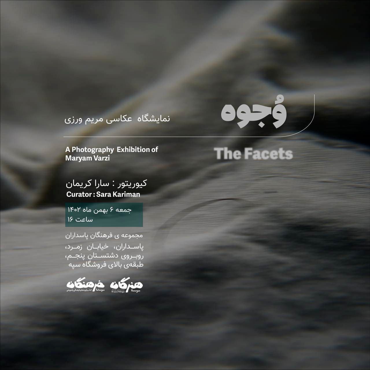 نمایشگاه انفرادی عکاسی مریم ورزی با نام «وجوه»، جمعه ششم بهمنماه در مجموعه فرهنگان(شعبه پاسداران) افتتاح خواهد شد.