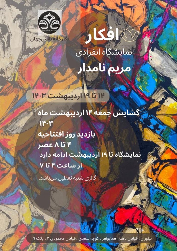 نمایشگاه نقاشیهای «مریم نامدار» با عنوان «افکار»، روز جمعه ۱۴ اردیبهشتماه ساعت ۱۶ در نگارخانه «نقش جهان» افتتاح میشود.