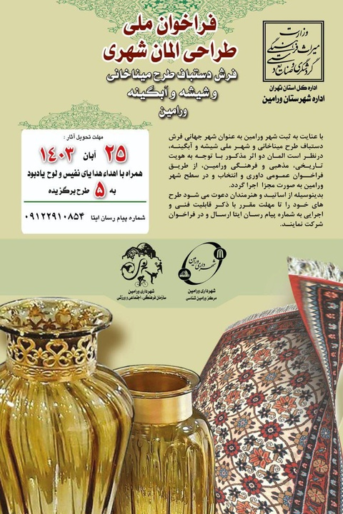 رئیس اداره میراثفرهنگی، گردشگری و صنایعدستی شهرستان ورامین، از انتشار فراخوان ملی طراحی المان شهری شیشه، آبگینه و فرش ورامین با همکاری شهرداری این شهر خبر داد.