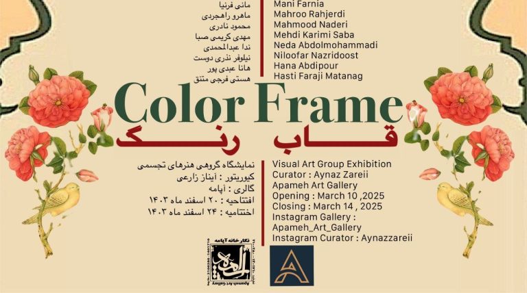 نمایشگاه گروهی هنرهای تجسمی «قاب رنگ» با شرکت ۲۰ هنرمند در رشتههای مختلف هنرهای تجسمی، روز دوشنبه، ۲۰ اسفندماه سال جاری به شکل آنلاین در گالری آپامه برگزار خواهد شد.