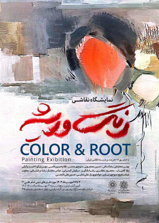 در «رنگ و ریشه» آثاری از بهمن محصص، رضا مافی، حسین محجوبی، منوچهر معتبر، غلامحسین نامی، بهمن نیکو، احمد وکیلی، ژیلا کامیاب، معصومه مظفری، رضا بانگیز، سیاوش کسرایی، عباس مختار، رضا درخشانی، یعقوب عمامهپیچ، منوچهر نیازی، جواد نوبهار، علی ندایی و حسینعلی ذابحی به نمایش درمیآید.