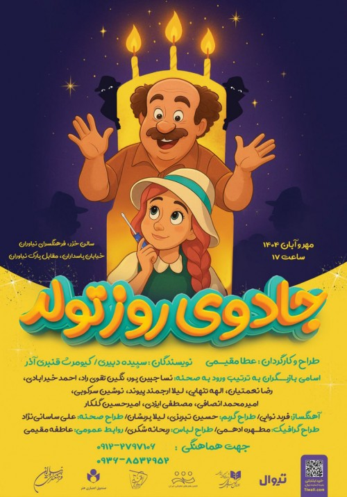 نمایش «جادوی روز تولد» ویژه کودکان، به نویسندگی و کارگردانی عطا مقیمی، از پنجشنبه هفدهم مهر ماه ۱۴۰۴، روزهای پایانی هفته (چهارشنبه تا جمعه) از ساعت ۱۷، در سالن خزر فرهنگسرای نیاوران اجرا میشود.