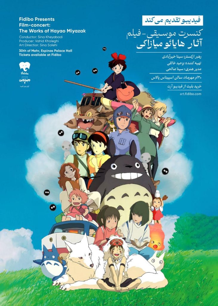 به گزارش روابطعمومی فیدیبو،کنسرت موسیقیفیلم انیمههای هایائو میازاکی، چهارشنبه ۳۰ مهر در دو سانس ۱۹ و ۲۲ در سالن رویال تهران اسپیناس پالاس توسط فیدیبو برگزار میشود.