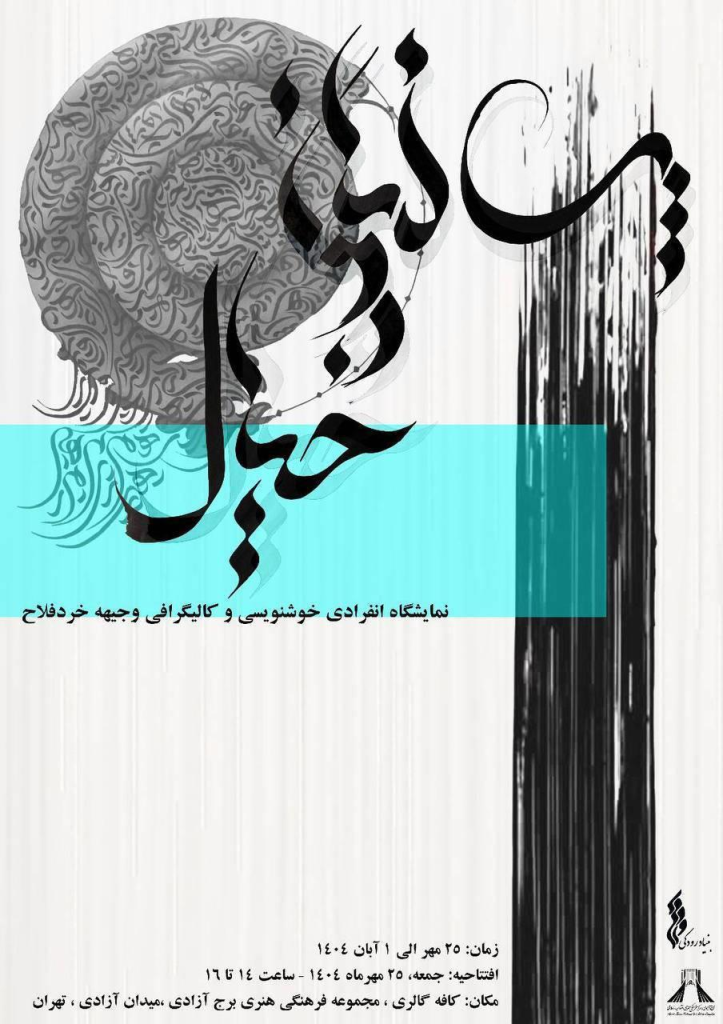 نمایشگاه نقاشیخط «پرنیان خیال» با آثار وجیهه خردفلاح، روز جمعه ۲۵ مهرماه از ساعت ۱۴ در کافهگالری مجموعه فرهنگیهنری برج آزادی افتتاح میشود.