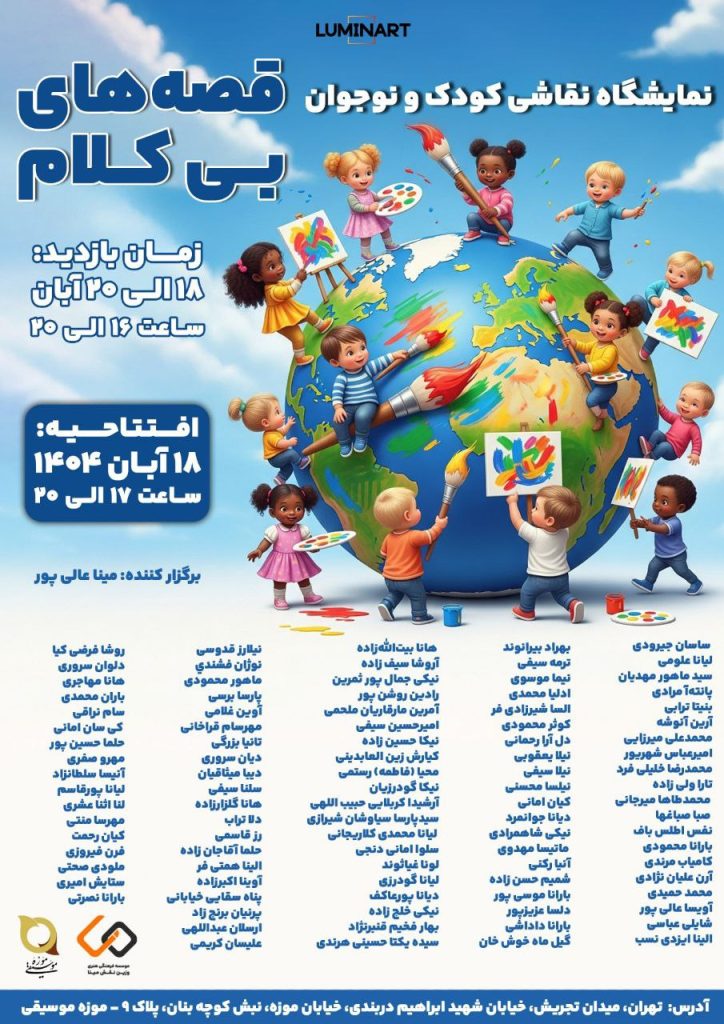 به گزارش سایت هنردستان به نقل از مشاور رسانه موسسه فرهنگی هنری وزین نقش مینا، نمایشگاه گروهی «قصههای بیکلام» با شرکت ۱۰۰ هنرمند نقاش کودک و نوجوان، ساعت ۱۷ روز یکشنبه، ۱۸ آبان ماه ۱۴۰۴ با حضور مینا عالی پور نقاش و مدیر مؤسسه فرهنگی هنری وزین نقش مینا و همچنین، پدیدآورندگان آثار در موزه موسیقی ایران افتتاح میشود.