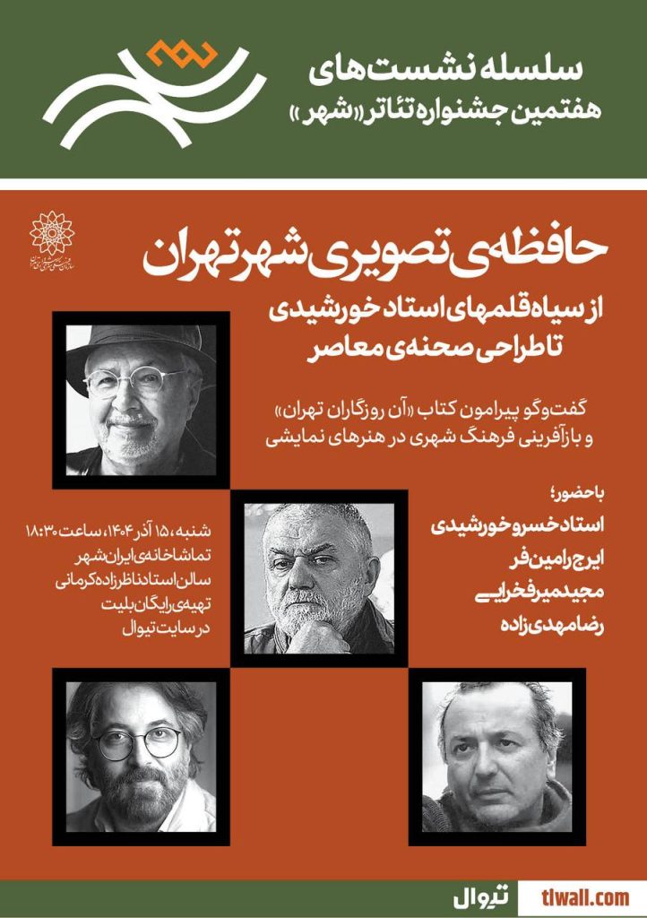 سومین نشست از سلسلهنشستهای هفتمین جشنواره تئاتر «شهر» با عنوان «حافظهی تصویری شهر تهران؛ از سیاهقلمهای استاد خورشیدی تا طراحی صحنهی معاصر» با حضور خسرو خورشیدی و جمعی از هنرمندان و پژوهشگران برگزار میشود.