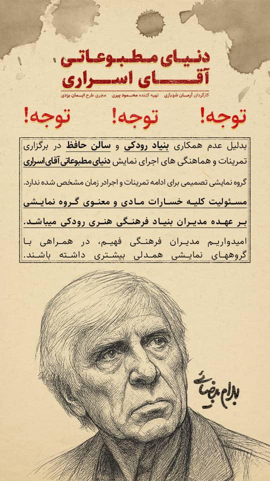ایمان یزدی، مجری طرح و مدیر تولید نمایش «دنیای مطبوعاتی آقای اسراری»، با انتقاد تند از مدیریت تالار حافظ و بنیاد رودکی، از لغو برنامه تمرینات، بینظمی در زمانبندی و برخورد غیرحرفهای با گروههای تئاتری گفت و اعلام کرد که اجرای نمایش خود را در این سالن منتفی میداند و پیگیری حقوقی خسارات را در دستور کار قرار خواهد داد. دنیای مطبوعاتیِ آقای اسراری نوشتهی بهرام بیضایی، با سختیهای فراوان از استاد بیضایی مجوز گرفته است. در مسیر تمرین و رسیدن به اجرا با چالشهای بسیاری روبهرو بوده و تمام این مراحل را پشت سر گذاشته تا کاری با کیفیت و در شان مخاطب به اجرا ببرد حالا مشکلاتشان با تالار حافظ شروع شده است. ایمان یزدی، مجری طرح و مدیر تولید نمایش «دنیای مطبوعاتی آقای اسراری»، به تهیهکنندگی محمود پیری و کارگردانی ارمان شهبازی در گفتوگو با ما درباره مشکلات پیشآمده با تالار حافظ و بنیاد رودکی توضیح داد.