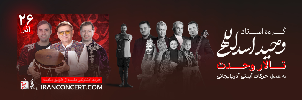 کنسرت گروه موسیقی آذربایجانی وحید اسداللهی، از ساعت ۲۱:۳۰ شامگاه چهارشنبه ۲۶ آذر ماه در تالار وحدت برگزار میشود.