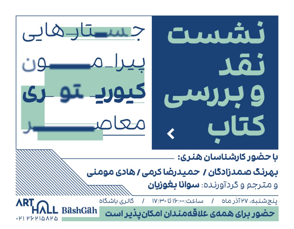 نشست نقد و بررسی کتاب «جستارهایی پیرامون کیوریتوری معاصر» به ترجمه و گردآوری سوانا بغوزیان از نشر تالار هنر، با حضور کارشناسان هنری در روز پنجشنبه، تاریخ ۲۷ آذر ماه در گالری «باشگاه» برگزار میشود.