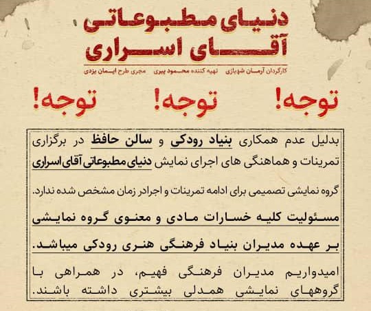 «همینی که هست»؛ سیاست بنیاد رودکی ایمان یزدی، مجری طرح و مدیر تولید نمایش «دنیای مطبوعاتی آقای اسراری»، با انتقاد تند از مدیریت تالار حافظ و بنیاد رودکی، از لغو برنامه تمرینات، بینظمی در زمانبندی و برخورد غیرحرفهای با گروههای تئاتری گفت و اعلام کرد که اجرای نمایش خود را در این سالن منتفی میداند […]