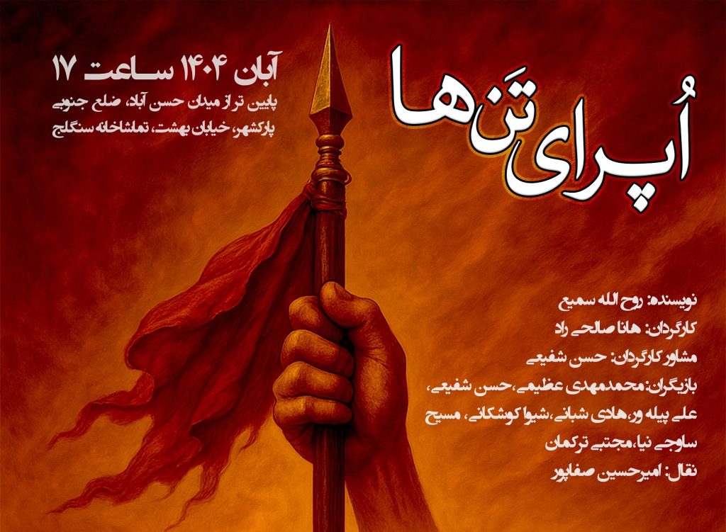 نمایش «اپرای تنها» نوشته روحالله سمیع با کارگردانی هانا صالحیراد از ۱۲ آبان در تماشاخانه سنگلج روی صحنه میرود. به گزارش روابطعمومی تماشاخانه سنگلج، نمایش «اپرای تنها» که هانا صالحیراد آن را کارگردانی کرده از روز دوشنبه ۱۲ آبان در ساعت ۱۷ اجرای خود را در تماشاخانه سنگلج آغاز می کند. این نمایش که نوشته […]