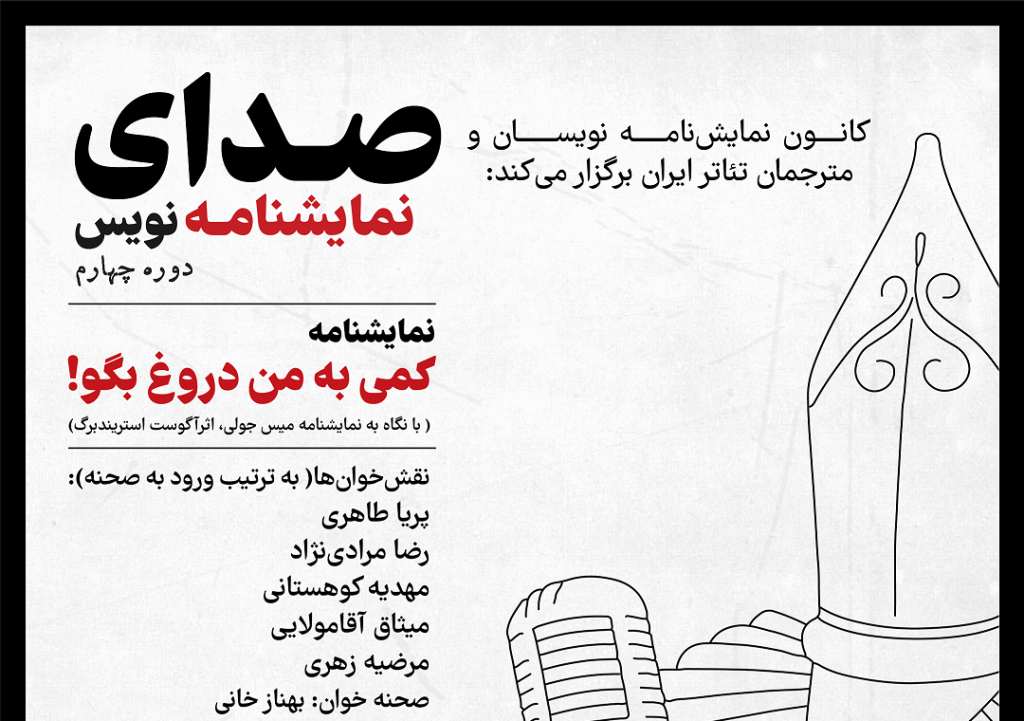 نمایشنامه «کمی به من دروغ بگو» نوشته مریم منصوری که اقتباسی از نمایشنامه «دوشیزه جولیا» و تداوم داستان این اثر آگوست استریندبرگ در ۱۰ سال بعد است، در دوره چهارم رپرتوار «صدای نمایشنامهنویس» خوانده میشود. این برنامه با همکاری کانون نمایشنامهنویسان خانه تئاتر ایران و تماشاخانه هیلاج برگزار میشود. این نمایشنامهخوانی با کارگردانی مریم منصوری […]