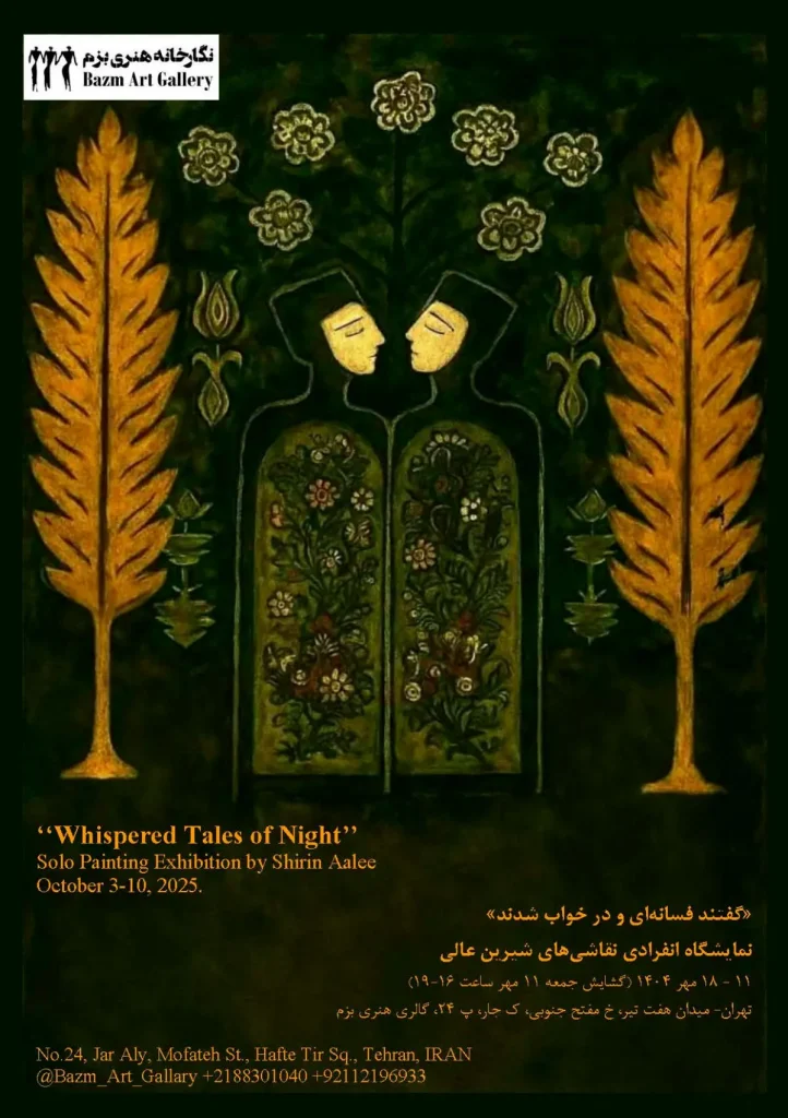 نمایشگاه نقاشیهای شیرین عالی با عنوان «گفتند فسانهای و در خواب شدند» ۱۱ مهرماه ۱۴۰۴ در گالری بزم گشایش مییابد. به گزارش هنردستان ، این مجموعه شامل ۱۳ تابلوی نقاشی در ابعاد ۱۰۰ در ۸۰ سانتیمتر با تکنیک آکریلیک روی بوم است. شیرین عالی (متولد ۱۳۶۳) دانشآموخته کارشناسی زبان فرانسوی، کارشناسی ارشد فلسفه هنر و […]